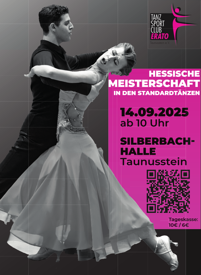 Am Sonntag, den 14. September 2025 veranstalten wir, der TSC Erato Taunusstein e.V., die hessische Landesmeisterschaft in den Standardtänzen der höchsten Klassen. Die besten Standardpaare aus Hessen werden in der Silberbachhalle in Wehen zusammenkommen und um den Titel „Landesmeister“ um die Wette tanzen. Die Vorbereitungen dafür laufen bereits auf Hochtouren. Auf dieser Seite finden Sie alle aktuellen Informationen.